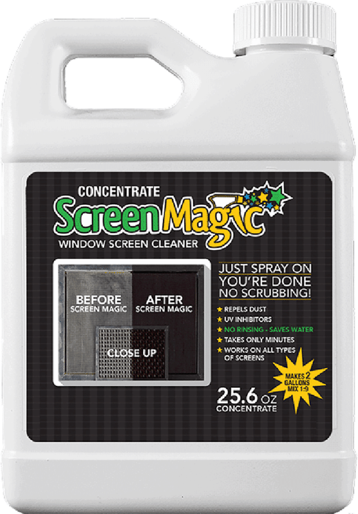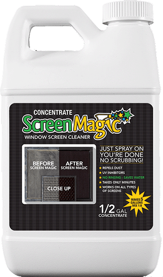 Screen Magic eliminates the need to scrub screens. Just spray/wipe it on and your done. With Screen Magic you can clean the screen right next to the window. No more dragging them to the driveway and up and down the ladder! Your time is your most valuable asset. What do you value your time at? It should be at least $60 per hour. Most importantly the screens will look perfect every time!